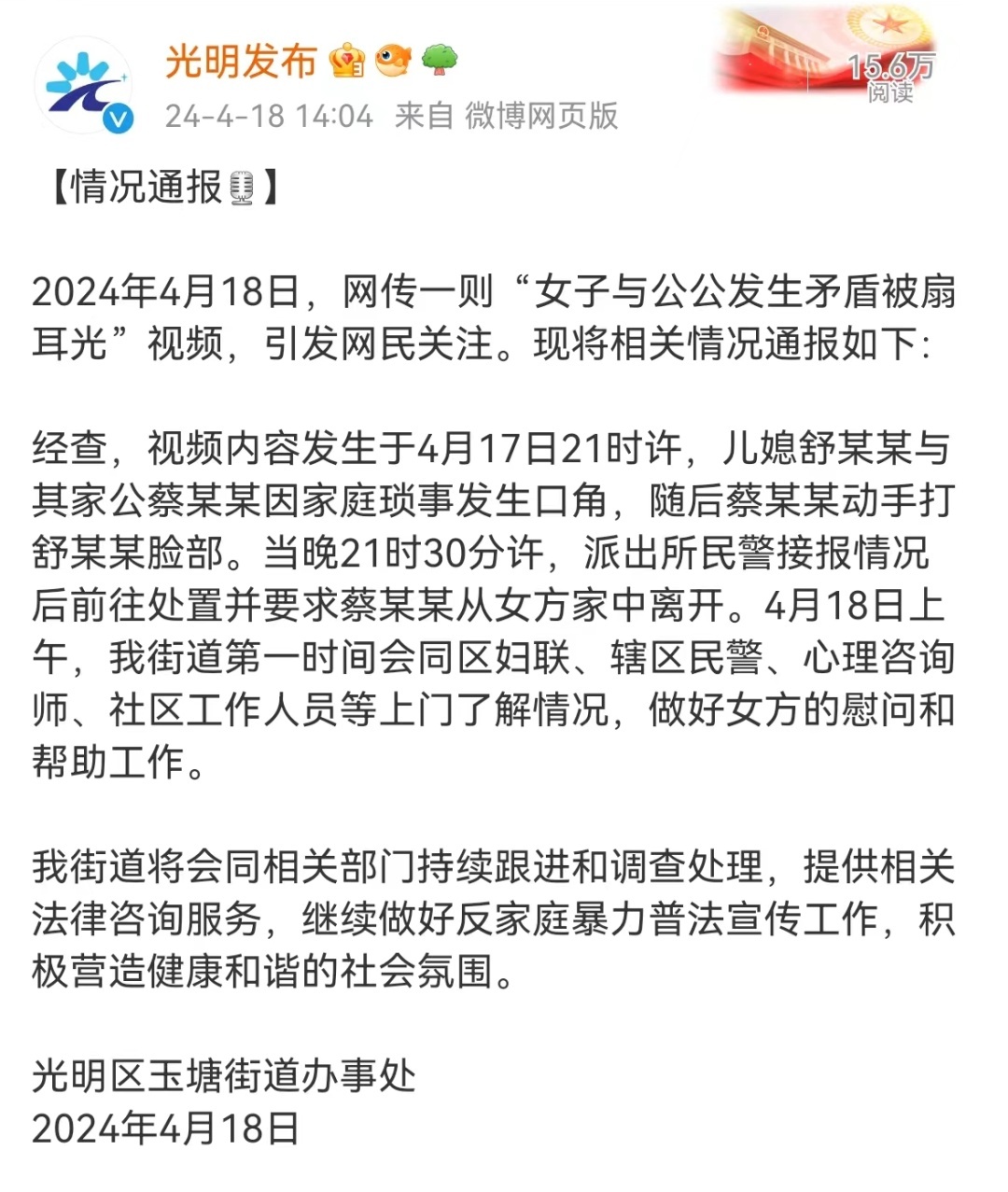 2024年4月18日,网传一则“女子与公公发生矛盾被扇耳光”视频,激励网民存眷。现将有关情况通报如下: