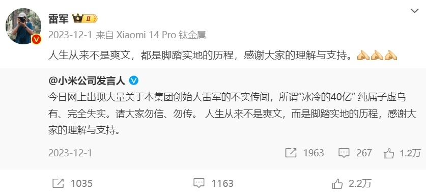 2023年12月1日,小米公司通过其官方微博@小米公司发言东谈主 暗示:当天网上出现无数对于本集团首创东谈主雷军的虚伪传奇,所谓“冰冷的40亿” 熟练虚伪虚假、十足舛讹。请全国勿信、勿传。