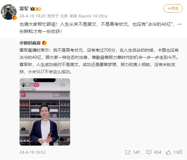 在直播中,雷军辟谣了我方“爽文东谈主生”的传言。雷军暗示,我方并不是高考状元,也莫得考700分,并且卡里也莫得冰冷的40亿,但愿全国帮衬辟谣。