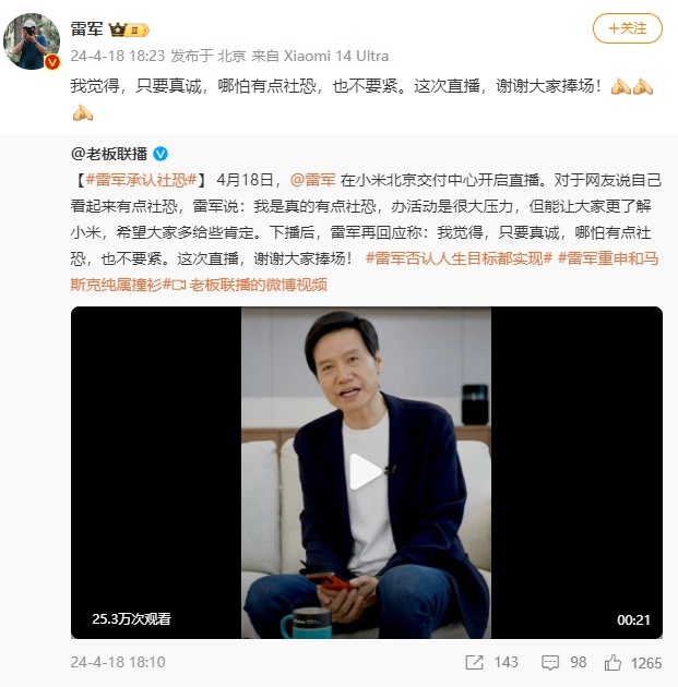 对于网友说我方看起来有点社恐,雷军说:“我是果然有点社恐,办活动是很大压力,但能让全国更了解小米,但愿全国多给些细目。”
