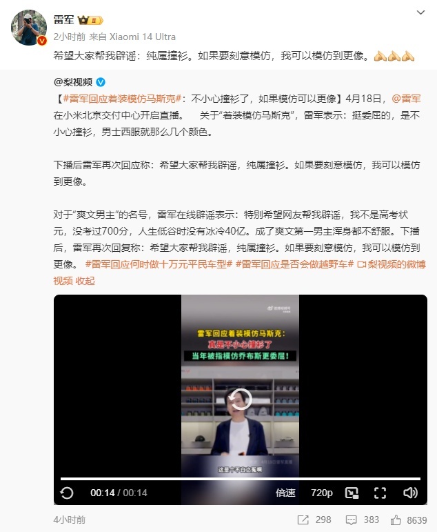 对于网上簸弄他在小米发布会的着装效法马斯克,雷军回话称,挺沉闷的,等于撞衫了,男士西服齐很像。