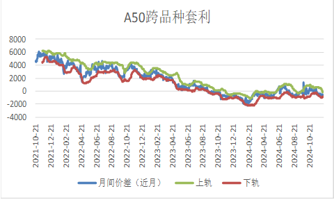 跨期套利:富时中国A50月间价差的布林通说念高下四肢围:[-14,32],提倡价差冲破此边界可进行套利。另外,刻下受分成影响,月间价差将扩大,提倡作念多价差。